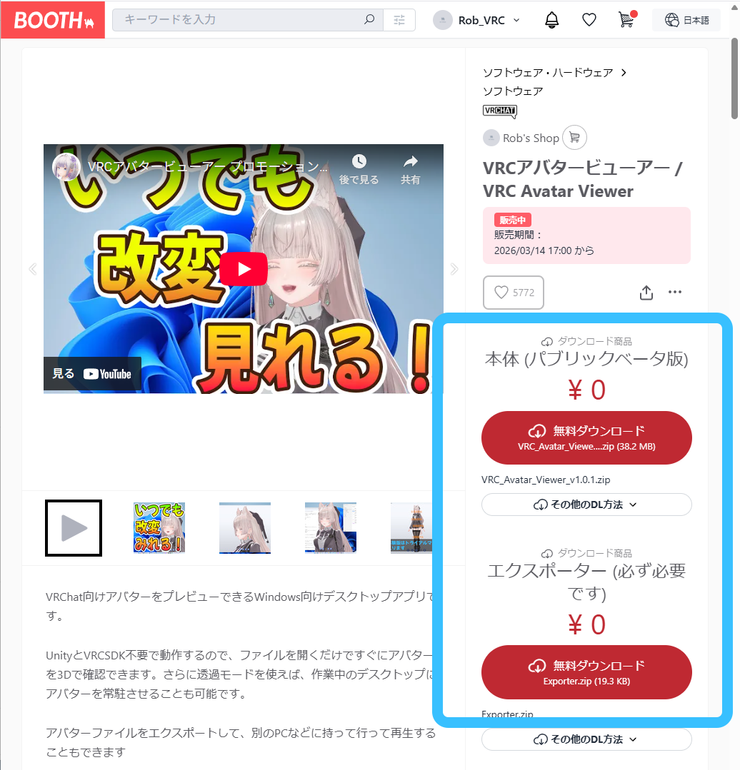 BOOTHの配布ページからビューアー本体(VRC Avatar Viewer)とエクスポーター(Exporter)をダウンロードします。