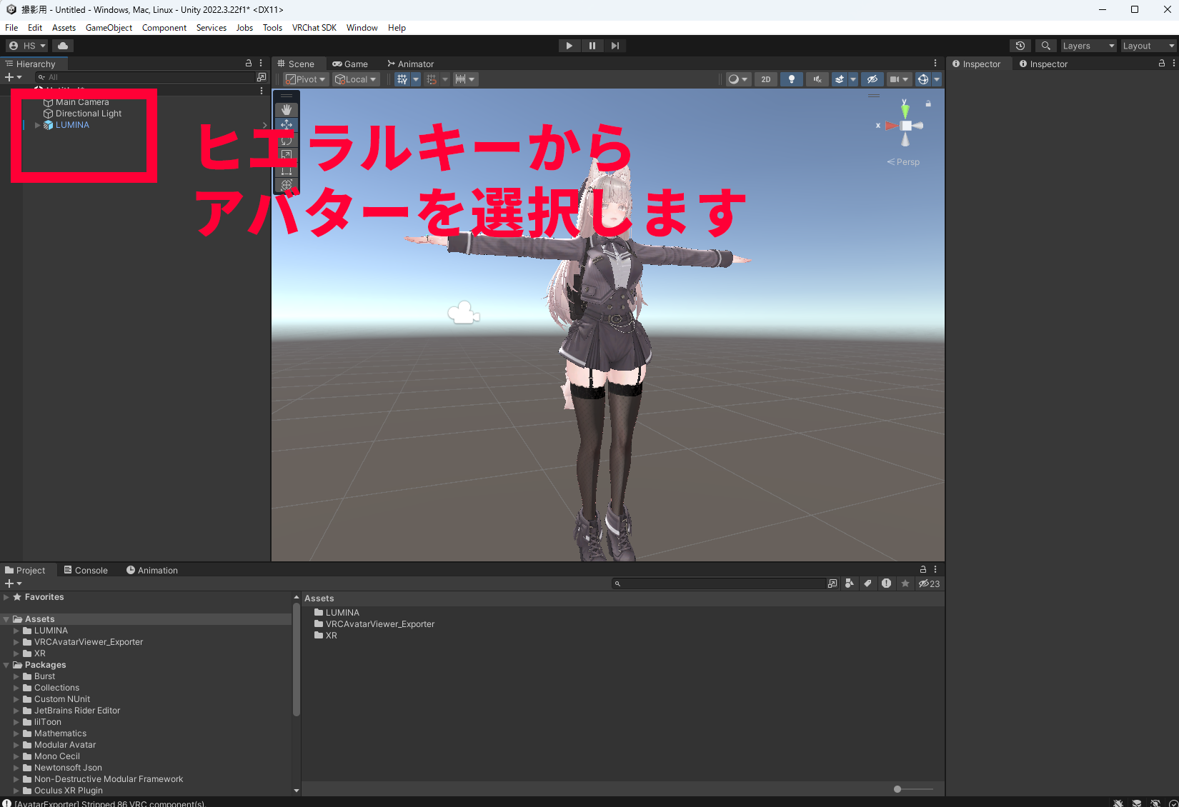 - UnityのHierarchy(画面左側のオブジェクト一覧)で、エクスポートしたいアバターを選択する アバターのルート(一番上の親オブジェクト)をクリック
