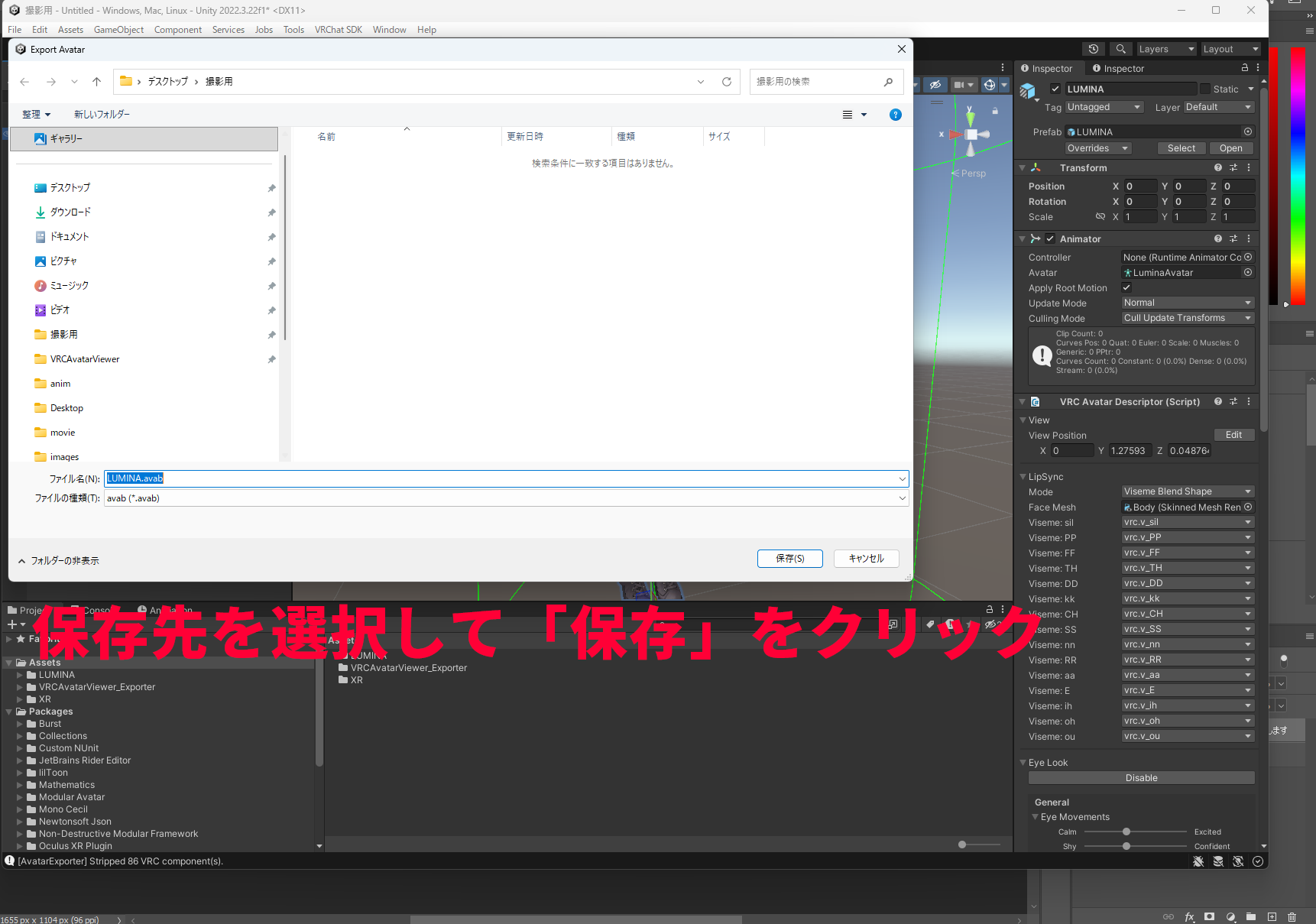 VRC Avatar Viewer→Export Avatar (.avab)を選択 - 保存先を選ぶダイアログが表示されるので、保存場所とファイル名を決めて「保存」をクリック